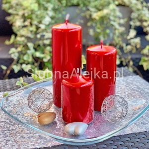 Świeca Ozdobna Pieńkowa Wysoki Połysk Czerwony to elegancka świeca z metalicznym wykończeniem na wysoki połysk. Uformowana w walec świeca może być ozdobą samą w sobie, ale także jednym z elementów dekoracyjnych. Znakomicie sprawdzi się jako centralny punkt stroika bożonarodzeniowego, ale także ślubnych kompozycji florystycznych. Można ją także postawić w towarzystwie świec o innych wysokościach na lustrzanym podstawku. Wówczas płomień odbija się w zwierciadle, a cała aranżacja zamienia się w błyszczący lampion. Świece pieńkowe palą się bardzo długo, a zatem możemy przestać martwić się o tę część dekoracji sali. Aby stworzyć prosty świecznik wystarczy ozdobny żwirek, podstawka i świeca. Bardzo często najprostsze rozwiązania są najlepsze i najbardziej oczekiwane. Komplet świec o różnej wysokości może być miłym i praktycznym prezentem dla bliskiej osoby.