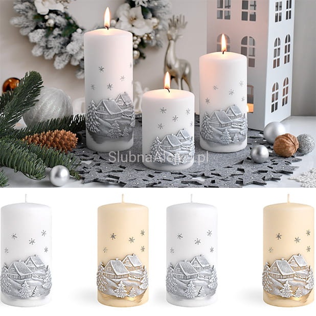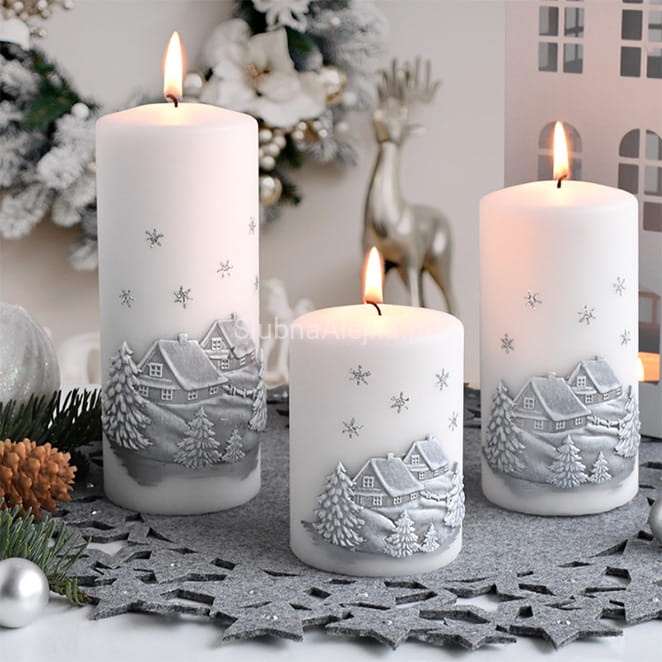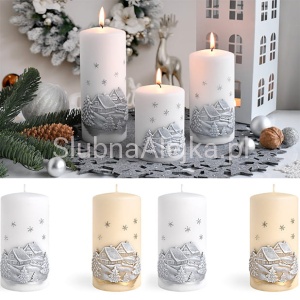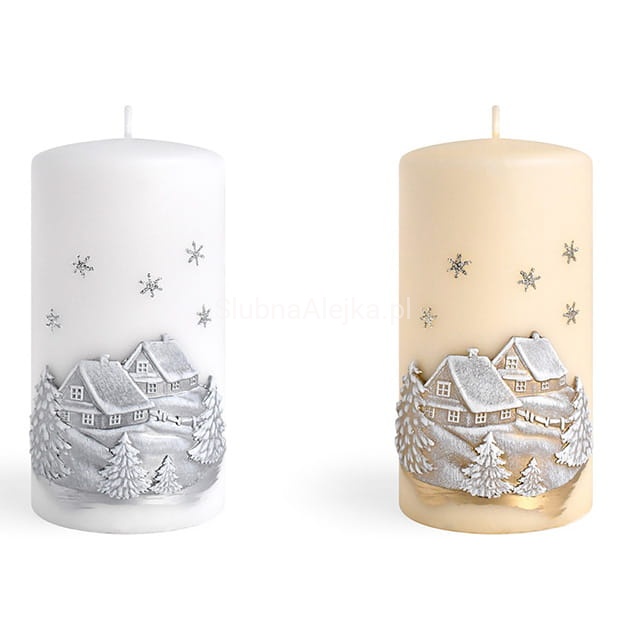 Świeca pieńkowa Zimowy Domek to wyjątkowo elegancka świeca zdobiona uroczymi domkami w śniegu. Ma gładką strukturę przez co bardzo wpisuje się w eleganckie wnętrza. Świeca jest w całości biała i pali się bardzo długo równym i jasnym płomieniem. Świeca z serii Zimowy Domek to atrakcyjny dodatek do większych pomieszczeń, np. salonów i kuchni połączonych z jadalnią. Świece pieńkowe w złotym odcieniu idealnie sprawdzą się w czasie organizacji różnego rodzaju przyjęć. Kilka takich świec o różnej wysokości i średnicy bez żadnych dodatków potrafi uformować znakomitą dekorację.