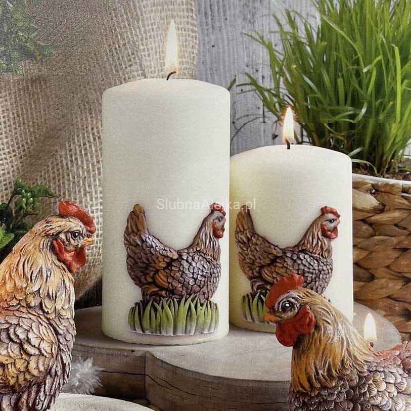 Świeca Ozdobna Walec z piękną aplikacją Kury Wielkanocnej to niezwykla urokliwa ozdoba stołu wielkanocnego. Wykonana ręcznie ale bardzo precyzyjnie z parafiny. Dwie świece o różnej wysokości zestawione razem na podstawku z naszej oferty ozdobią każde wymagające wnętrze. Po świece sięgamy także wyjątkowo chętnie w okresie wielkanocnym. Towarzyszą nam zwykle podczas długich rodzinnych spotkań, budując przytulny i ciepły nastrój wnętrz. Wyjątkowo mocno kojarzą się z czasem świątecznym. Świece mogą być ciekawym elementem aranżacji przez cały rok.