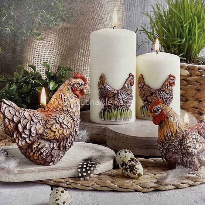 Świeca Ozdobna Walec z piękną aplikacją Kury Wielkanocnej to niezwykla urokliwa ozdoba stołu wielkanocnego. Wykonana ręcznie ale bardzo precyzyjnie z parafiny. Dwie świece o różnej wysokości zestawione razem na podstawku z naszej oferty ozdobią każde wymagające wnętrze. Po świece sięgamy także wyjątkowo chętnie w okresie wielkanocnym. Towarzyszą nam zwykle podczas długich rodzinnych spotkań, budując przytulny i ciepły nastrój wnętrz. Wyjątkowo mocno kojarzą się z czasem świątecznym. Świece mogą być ciekawym elementem aranżacji przez cały rok.