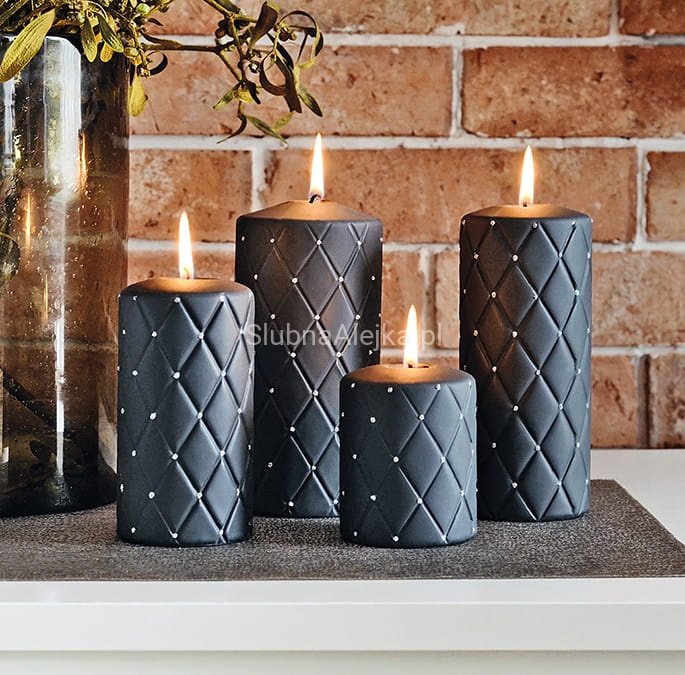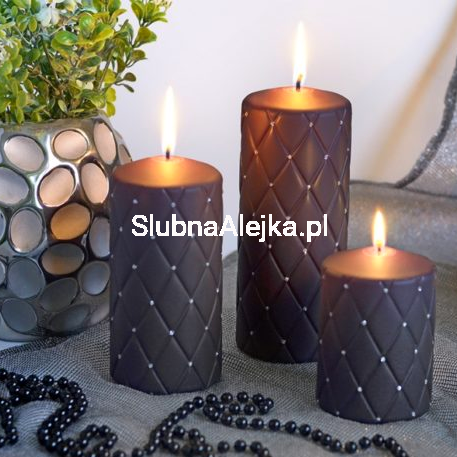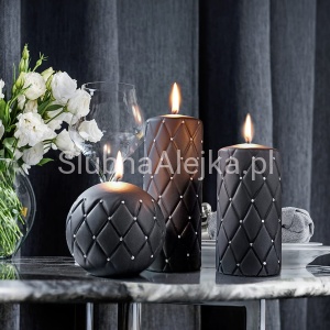 Wytworna świeca zdobiona małymi cyrkoniami. Świetnie nadaje się do aranżacji zarówno dużych sal, jak i małych przestrzeni, gdzie łatwo dobrać pasujące do siebie elementy dekoracji. Bardzo efektownie prezentuje się w zestawieniach po trzy lub pięć sztuk. Piękne podstawki z naszej oferty podkreślą efekt i sposób ich prezentacji.