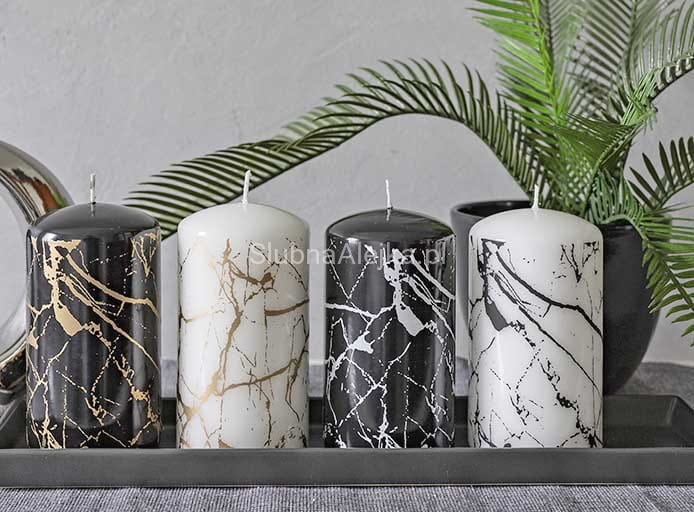 Świeca pieńkowa ozdobna marmur znakomicie podkreśli każdy styl. Na prostej podstawce, w towarzystwie świeczników szklanych lub drewnianych będzie tworzyć niezwykłą, pełną blasku aranżację. Świeca pieńkowa marmurowa o różnych wysokościach z powodzeniem może stanowić centralną cześć dekoracki stołu, czy kominka lub tworzyć przestrzenną dekorację z kilkoma świecami innego gatunku.