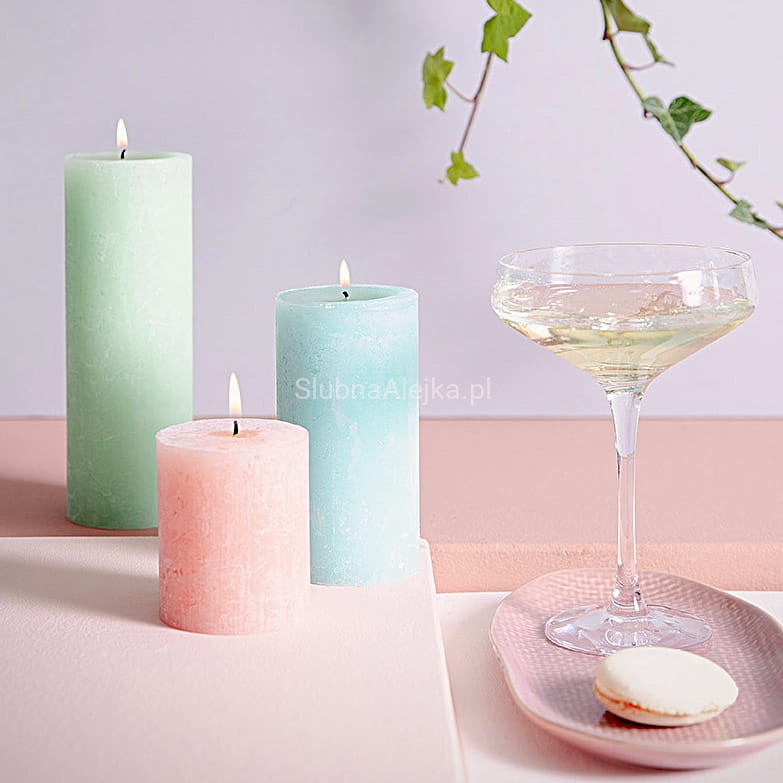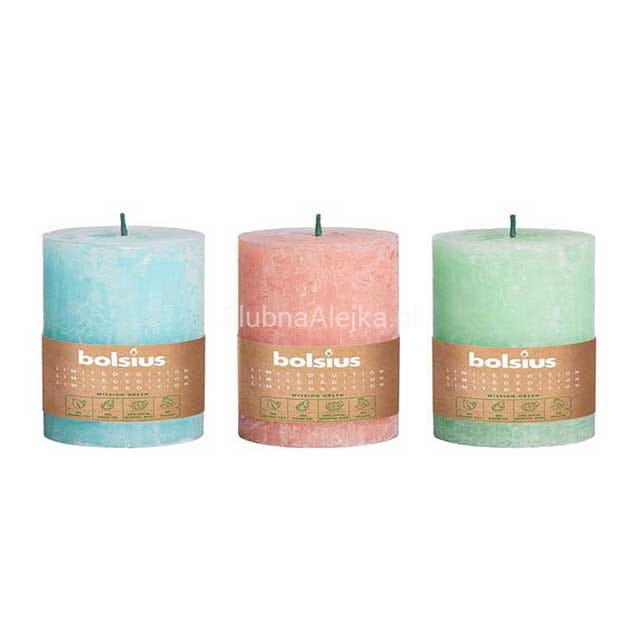 Świeca pieńkowa z przepięknej pastelowej kolekcji Bolsius Divine Earth renomowanego producenta swiec BOLSIUS. Ma surową formę i strukturę przez co bardzo wpisuje się w nowoczesne wnętrza i prosty minimalistyczny styl. Świeca jest w całości zabarwiona z ciekawim bawełnianym knotem i pali się bardzo długo równym i jasnym płomieniem. Bezzapachowa wykonana z wosku roślinnego i parafiny. Świeca z serii Rustic to atrakcyjny dodatek do większych pomieszczeń, np. salonów i kuchni połączonych z jadalnią. Matowe świece kule w odcieniach pastelowych idealnie sprawdzą się w czasie organizacji różnego rodzaju przyjęć. Kilka takich świec o różnej wysokości i średnicy bez żadnych dodatków potrafi uformować znakomitą dekorację. Do wyboru piękna paleta kolorów. Czas palenia 30 godzin.