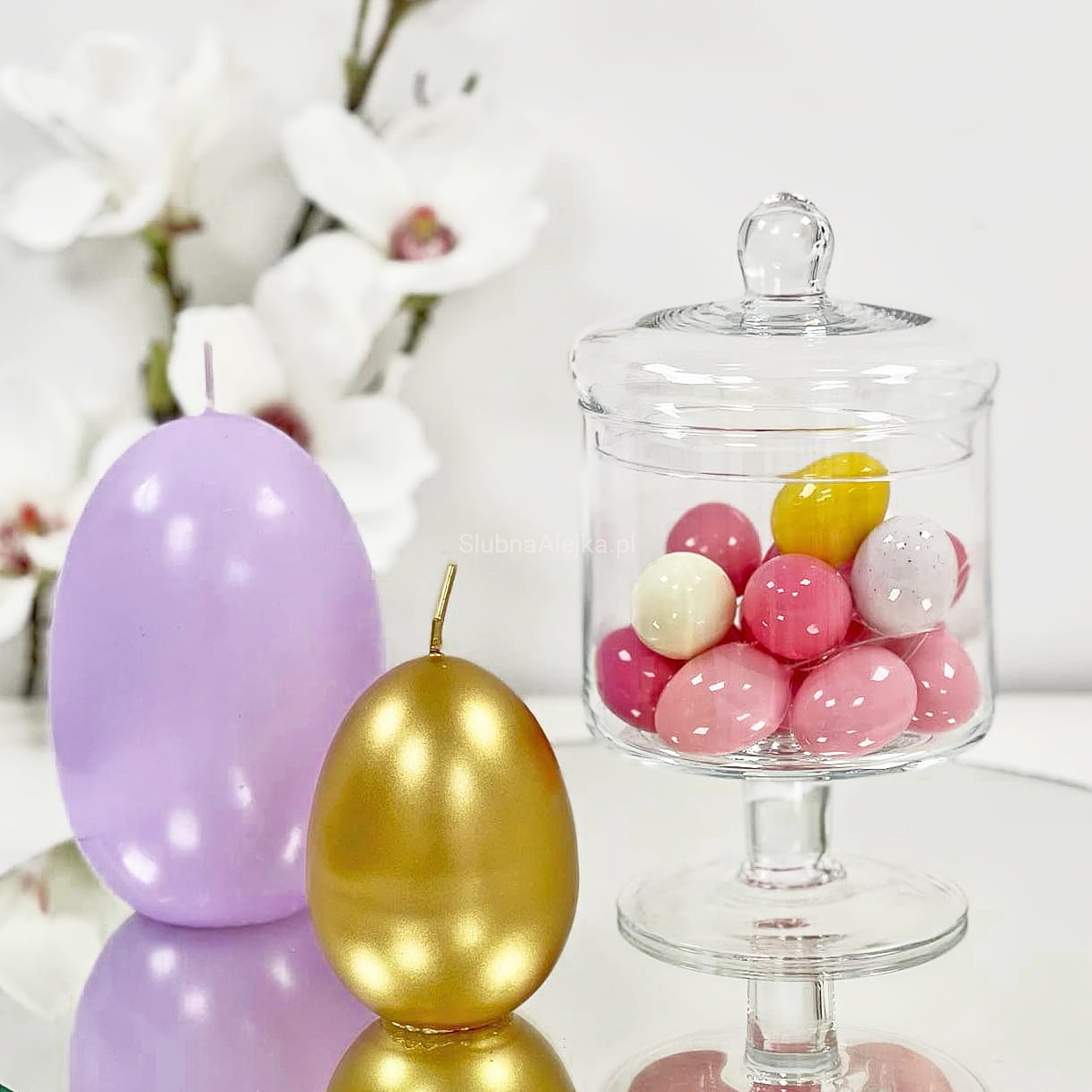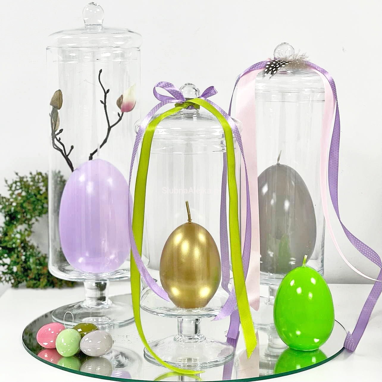 Świece wielkanocne mają niezwykłą zaletę, że kształtem lub wzorem nawiązują do Świąt Wielkiej Nocy. Świecę w kształcie dużego jajka doskonale sprawdzą się do aranżacji wnętrz i kompozycji florystycznych. Świecznik, który idealnie nadaje się do tego, aby stworzyć kompozycję dla świec pływających, to wazon lub misa szklana, do których można dodać mech, kamienie dekoracyjne oraz wianki. Piękna gama kolorystyczna do wyboru. Każda świeczka jest lekko nabłyszczana.