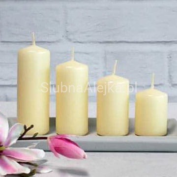 Zestaw świec pieńkowych stopniowanych w czterech wysokościach. Pięknie prezentują się jako ozdoba stołu układane w szklanych świecznikach lub w grupie świec na podstawce. Bogata kolorystyka sprawia, że można dopasować je względem wnętrza lokalu lub uroczystości.