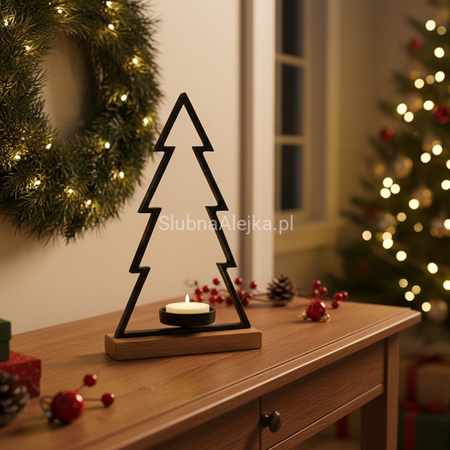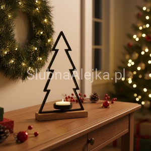 Świecznik Choinka Czarny na drewnianej podstawie to świąteczny, minimalistyczny element bożonarodzeniowej aranżacji