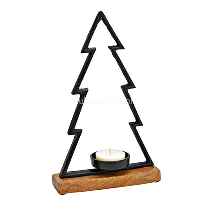 Świecznik Choinka Czarny, metalowy na drewnianej podstawie z miejscem na świeczkę typu tealight to minimalistyczna i praktyczna forma dekoracji, która sprawdzi się by nadać wnętrzu stylu i świątecznej atmosfery. Dzięki konstrukcji drewna i metalu, dobrze znosi użytkowanie w warunkach komercyjnych.