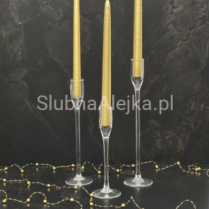 Świecznik szklany na nodze Stożkowy to bardzo elegancki świecznik stwożony specjalnie do świec stożkowych. Wykonany został z bardzo wytrzymałego szkła i stanowi wspaniałą klamrę aranżacyjną. Zestaw takich świeczników szklanych na nodze w kilku różnych wysokościach można ustawić obok siebie tworząc przestrzenny kandelabr lub w zupełnie oddzielnych punktach, rozsianych po całej sali. W drugim przypadku warto zakupić kilka zestawów, aby wzbogacić cały wystrój pomieszczenia.