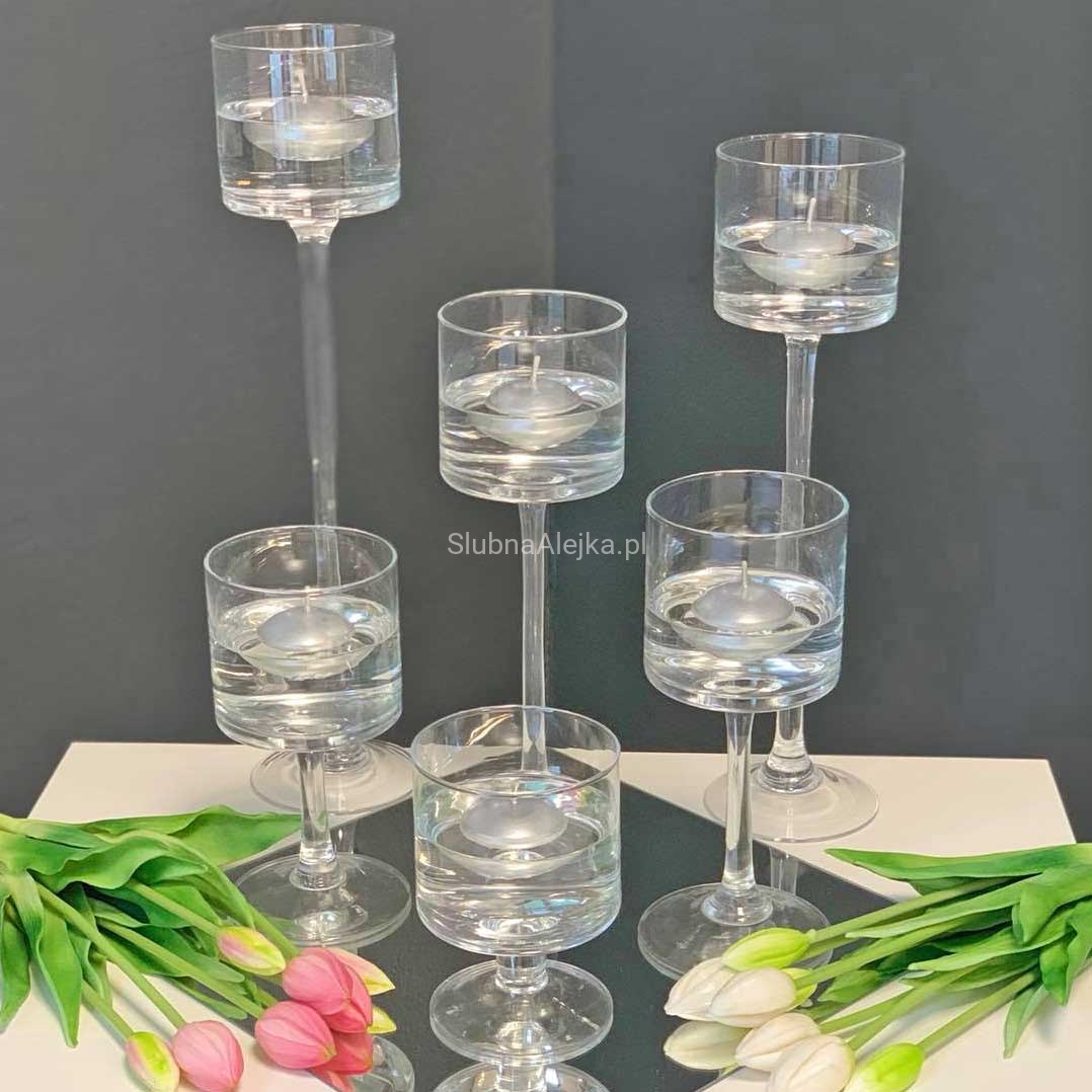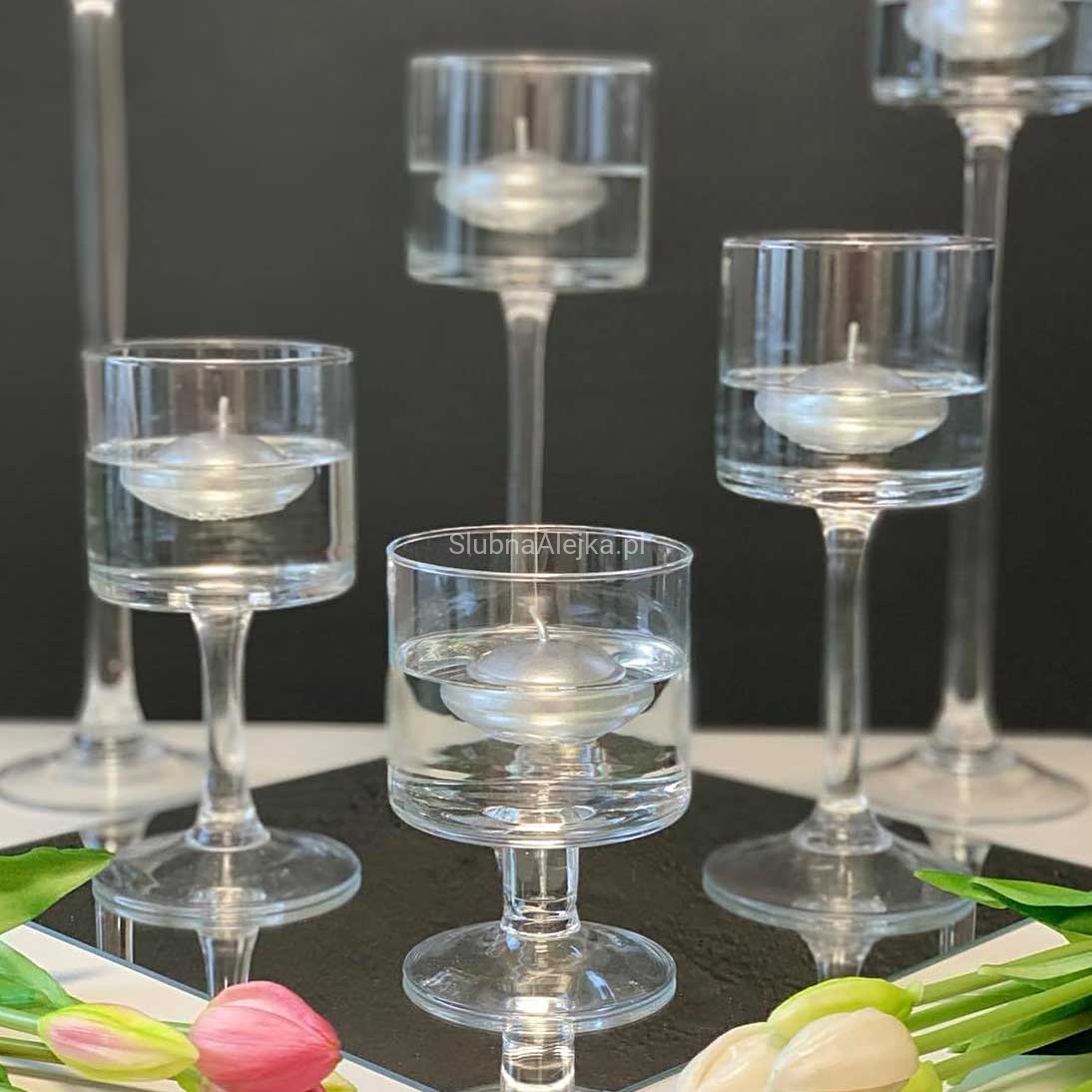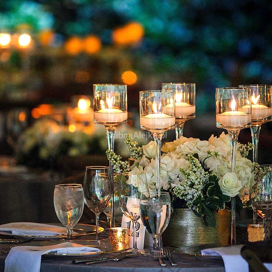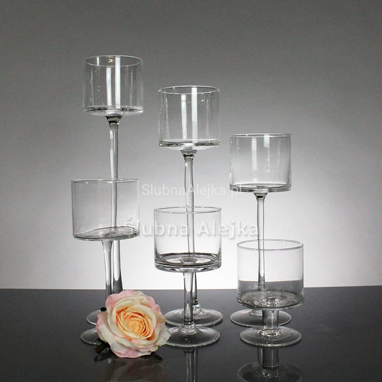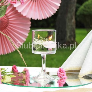 Piękny świecznik szklany na nodze koktajlowy będzie elegancko zdobił każdy stół i jest znakomitą ozdobą ślubną. Ze względu na swoją wysokość zalecany jest wyłącznie do dekoracji stołów, ewentualnie Candy Baru lub okien na sali weselnej. Znakomicie prezentuje się zarówno ze świeczkami typu tealight, jak i świecami kulami. Na dno takiego świecznika można z powodzeniem wsypać ozdobny żwirek lub piasek, uzupełniając całą aranżację.