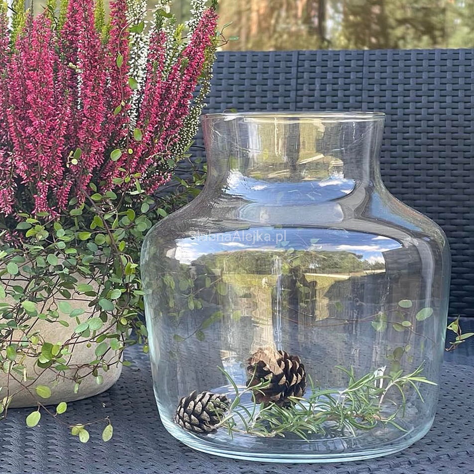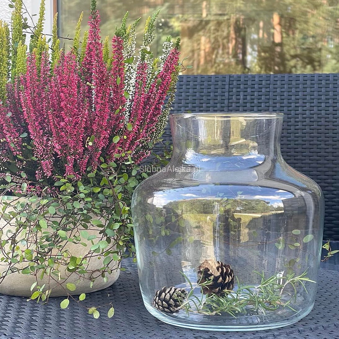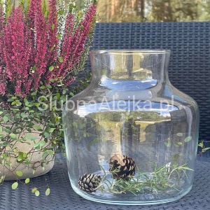 Szklany Słój Ozdobny Laura to przepiękne, nowoczesne naczynie wykonane z bezbarwnego szkła. Naczynie ma wysokość 25 cm, średnicę 22 cm i średnicę wlotu 13 cm. Zwężenie u góry słoja stanowi ciekawy element ozdobny. Naczynie jest wykorzystywane w dekoracjach sezonowych, ślubnych, komunijnych i dekoracjach na chrzest.