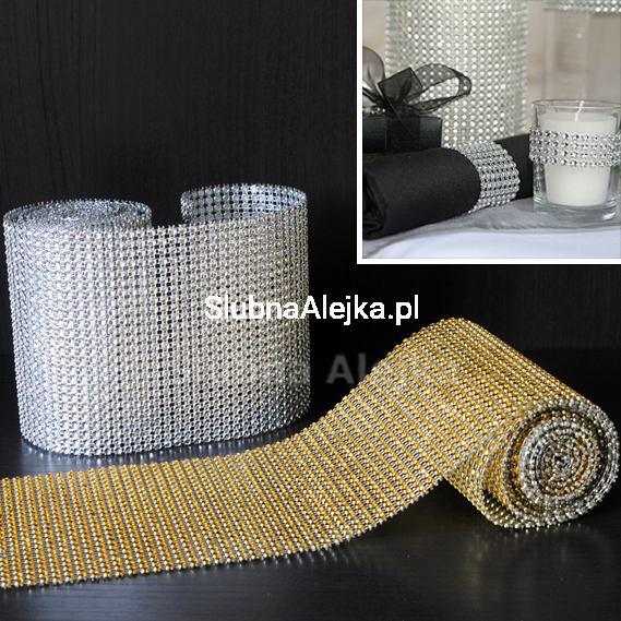 Przepiękna taśma diamentowa służy przede wszystkim jako ozdoba ślubna do tworzenia wyjątkowych, eleganckich dekoracji.Udekorowane nim świece, tort, czy wazony wprawią Twoich gości w prawdziwy zachwyt! Taśmę można przeciąć nożyczkami, uzyskując w ten sposób dowolną szerokość lub długość. Można wykorzystać ją jako obrączkę na serwetki lub jako element oplatający bukiet kwiatów. Taśma diamentowa to także ozdoba weselna, którą można zasłonić mniej estetyczne fragmenty aranżacji. Jeśli stoły mają odpowiednią szerokość można wykorzystać ją również jako oryginalny bieżnik. W towarzystwie świec przepięknie iluminuje przestrzeń.