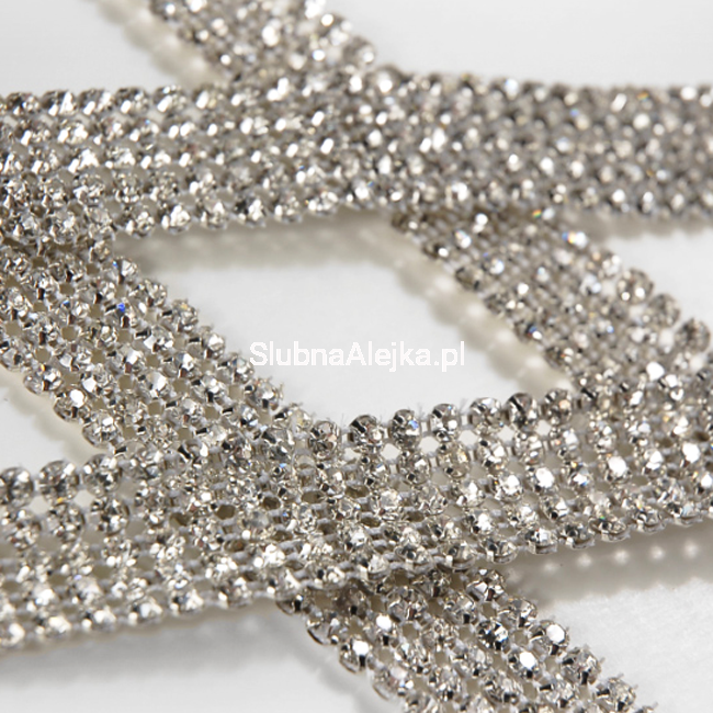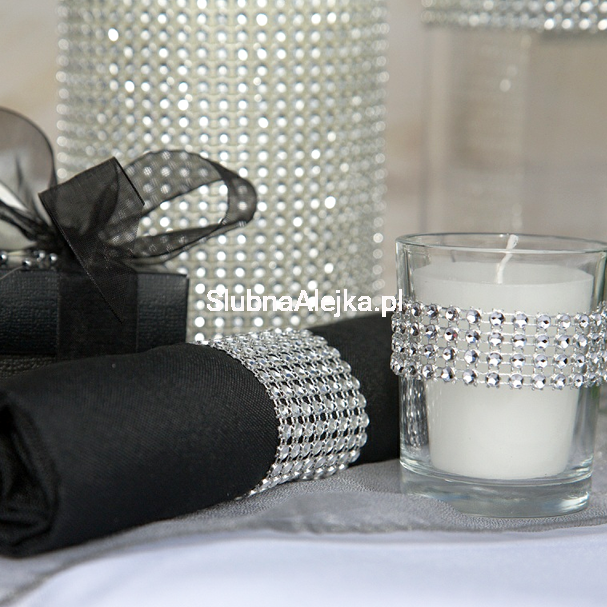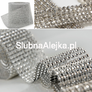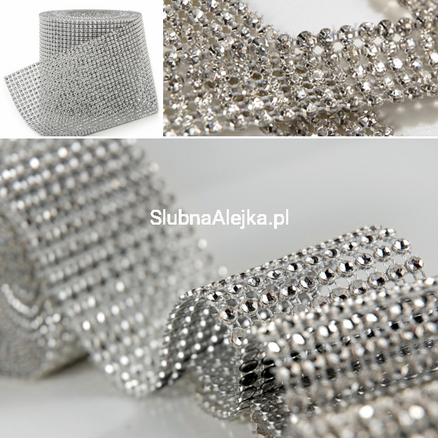 Przepiękna taśma diamentowa służy przede wszystkim jako ozdoba ślubna do tworzenia wyjątkowych, eleganckich dekoracji.Udekorowane nim świece, tort, czy wazony wprawią Twoich gości w prawdziwy zachwyt! Taśmę można przeciąć nożyczkami, uzyskując w ten sposób dowolną szerokość lub długość. Można wykorzystać ją jako obrączkę na serwetki lub jako element oplatający bukiet kwiatów. Taśma diamentowa to także ozdoba weselna, którą można zasłonić mniej estetyczne fragmenty aranżacji. Jeśli stoły mają odpowiednią szerokość można wykorzystać ją również jako oryginalny bieżnik. W towarzystwie świec przepięknie iluminuje przestrzeń.
