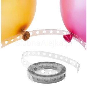 Taśma do girland balonowych to znakomite podłoże do stworzenia pięknej dekoracji ślubnej na sali weselnej. Każdy napompowany balon należy ściśle zawiązać, a końcówkę przełożyć przez specjalnie przygotowane oczko w girlandzie. Taśma ma 5 m długości, a zatem pomieści dziesiątki balonów, które można umieścić pod sufitem w poziomie lub na ścianie w pionie. Balony bardzo dobrze się trzymają i nie wypadają z oczek. Taśmę można także zwinąć lub powyginać, aby urozmaicić upięcie. Z uwagi na jej przezroczystość – będzie transparentna i może stanowić element większej aranżacji. Jest również wytrzymała i odporna na złamania.