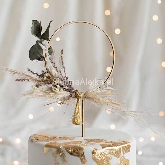 Okrągły topper na tort weselny to dekoracja równie efektowna, co uniwersalna w zastosowaniu. Doskonale wpisze się w stylistykę boho, rustykalną czy inspirowaną naturalnymi akcentami. W zależności od indywidualnych preferencji topper można udekorować kwiatami lub zielonymi roślinami. Do stworzenia oryginalnej dekoracji tortu posłużą żywe lub papierowe kwiaty, gałązki eukaliptusa, jak również rozmaite, dostosowane do wystroju sali ozdoby, np. wstążki, piórka czy frędzle. Topper drewniany obręcz na tort umieszczony jest na patyku dopuszczonym do kontaktu z żywnością, który umożliwia jego bezproblemowe wbicie w tort.