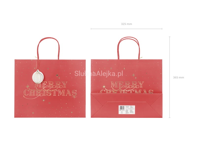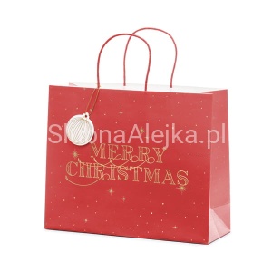 Świąteczna torebka papierowa na prezenty w pięknym, bordowym kolorze ze złotym napisem Merry Christmas i zawieszką w kształcie uroczej bombki.