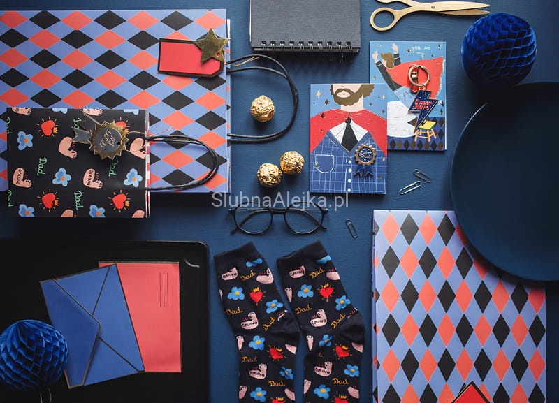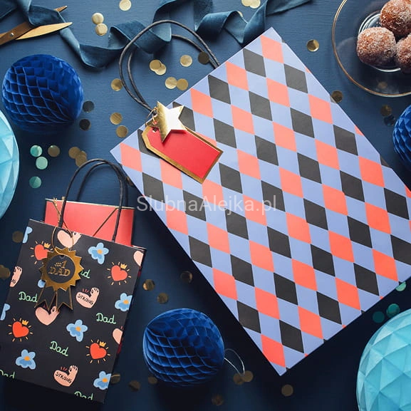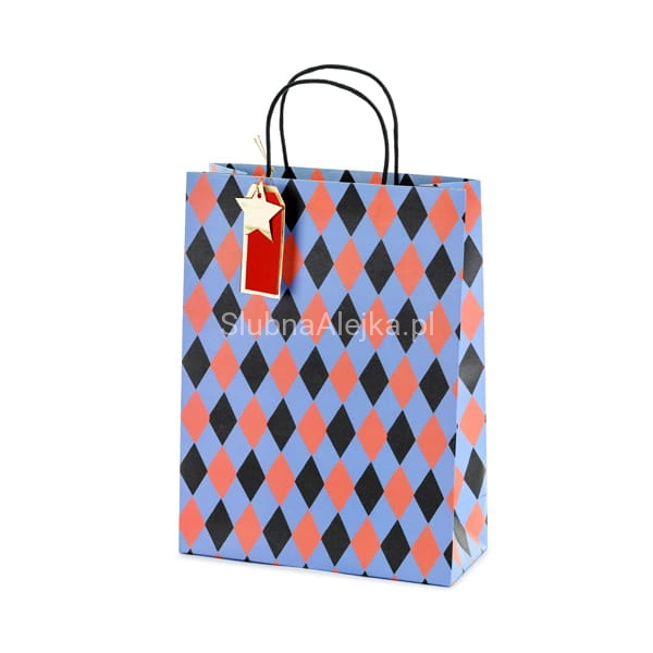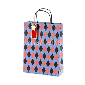 Świąteczna torebka papierowa na prezenty z dwoma zawieszkami, wzorów w romby.