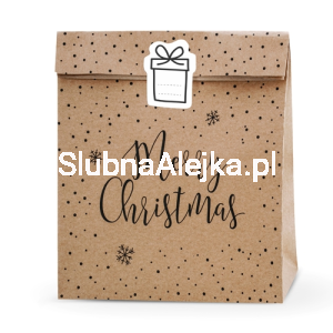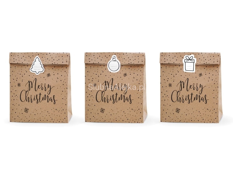 Torebki na prezenty Merry Christmas wykonane z kraftowego papieru z nadrukiem, zestaw zawiera 3 torebki i 3 naklejki, wymiary po złożeniu ok. 25 x 11 x 27 cm.