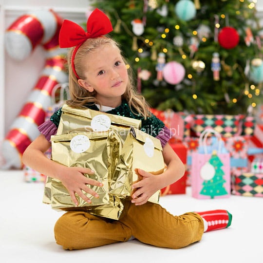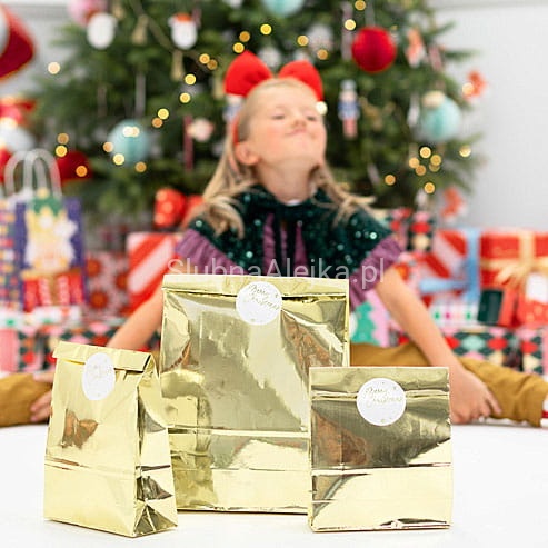 Torebki na prezenty w przepięknym złotym metalicznym wydaniu. Zestaw zawiera 3 torebki i 3 naklejki, wymiary po złożeniu 25 x 38 x 11 cm.