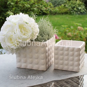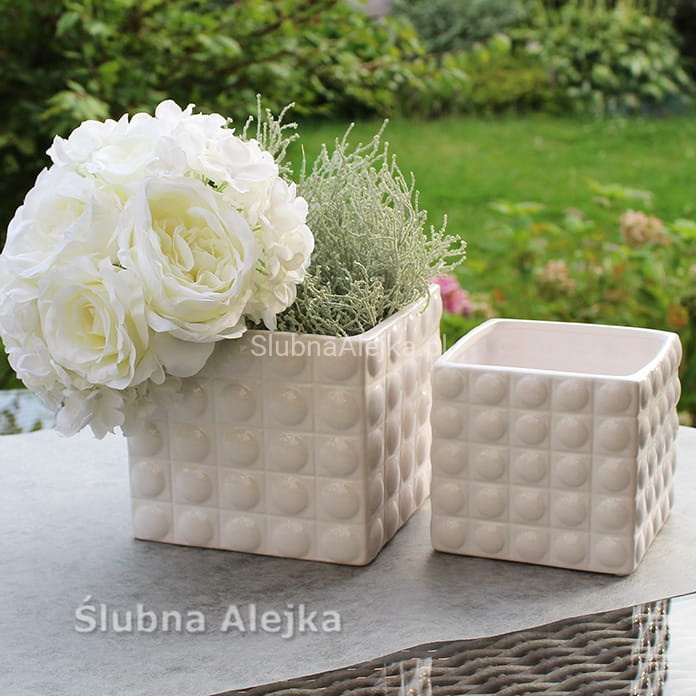 Wazon Ceramiczny Szkliwiony Biały 14 x 14 cm to element dekoracyjny w kształcie kostki wykonany z białej ceramiki szkliwionej. Zewnętrzne ścianki naczynia są ozdobione okrągłymi wypustkami, które nadają mu trójwymiarowości. Naczynie w kształcie kostki o długości i szerokości 14 cm oraz wysokości 13 cm pozwala na przygotowanie wielu atrakcyjnych dekoracji na stoły weselne, dekoracji urodzinowych i komunijnych. Wazon sprawdzi się również w każdym domu jako piękna ozdoba stołu.