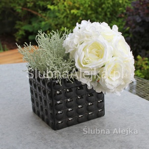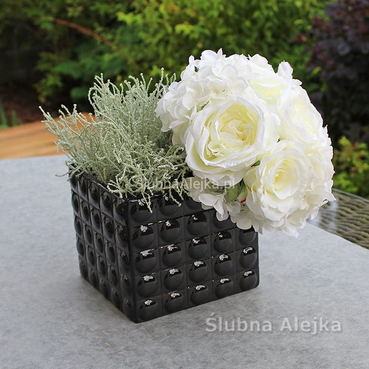 Wazon Ceramiczny Szkliwiony Czarny 14 x 14 cm to nowoczesny wazon utrzymany w klasycznej stylistyce. Wazon jest wykonany z ceramiki szkliwionej w kolorze czarnym i ozdobiony okrągłymi wypustkami, które pięknie załamują światło. Naczynie ma długość i szerokość 14 cm oraz wysokość 13 cm. Wazon jest często wykorzystywany jako dekoracja na stoły weselne, ale sprawdzi się również w każdym domu jako praktyczne i piękne naczynie na niewielkie bukiety.