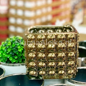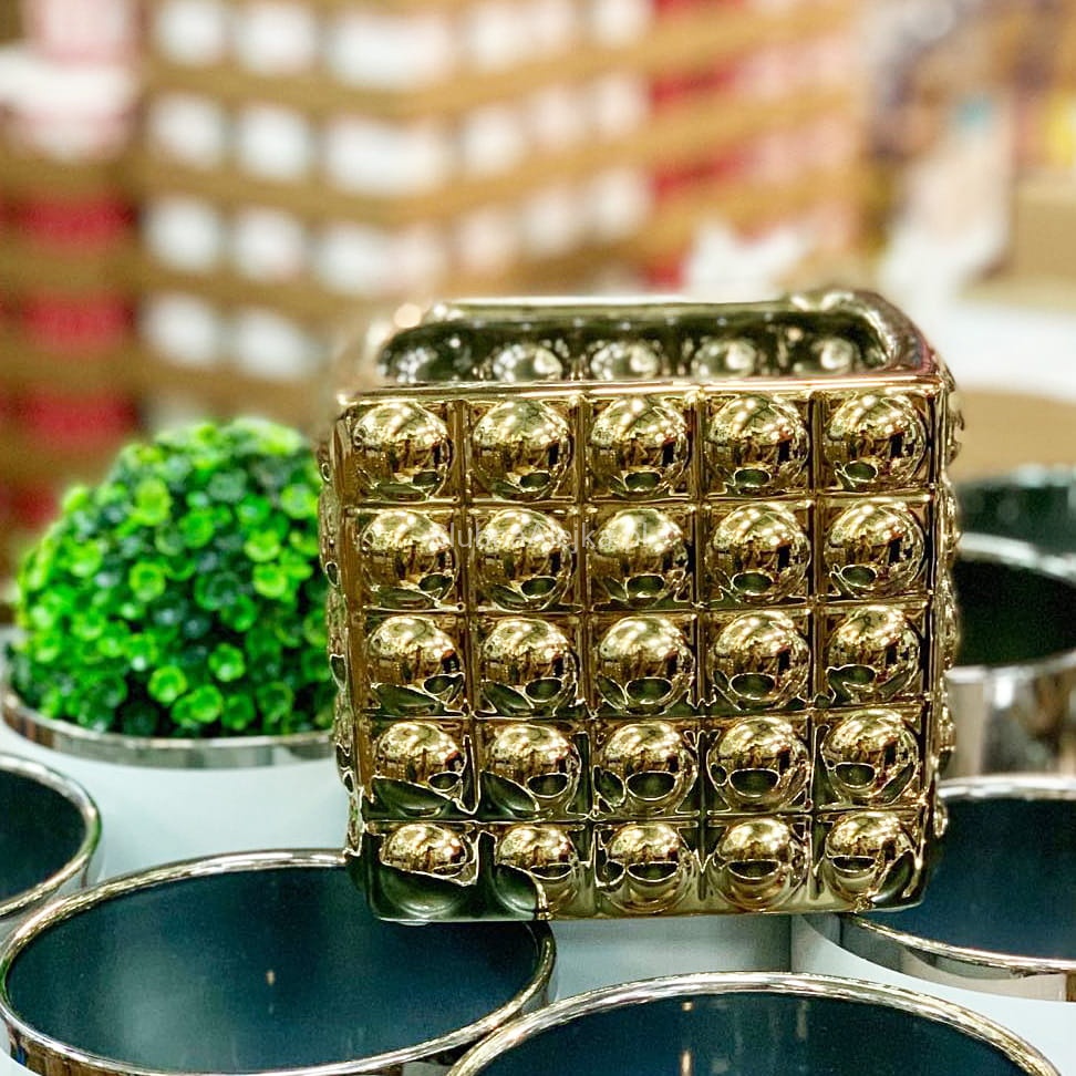 Wazon Ceramiczny Szkliwiony Złoty 17 x 17 cm to piękne naczynie do tworzenia dekoracji na stoły weselne. Wazon ma kształt kostki o wymiarach: długość 17 cm, szerokość 17 cm i jest w całości wykonany z najwyższej jakości ceramiki pokrytej szkliwem w złotym kolorze. Powierzchnia wazonu jest dodatkowo pokryta ozdobnymi wypustkami, które dają efekt trójwymiarowości.