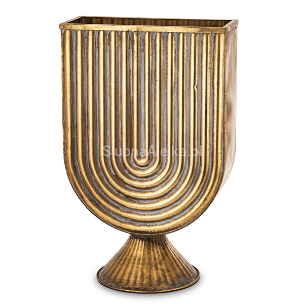 Wazon dekoracyjny na podstawie złoty to elegancka dekoracja, która cieszy się dużym uznaniem. Dzięki metalowej podstawie łączonej z wazonem przedmiot ten zyskuje elegancki design. Jest to produkt idealny do dekoracji przestrzeni domowj, restauracji, hotelu oraz na różnego rodzaju uroczystości i przyjęcia. Wysokość 55 cm, szerokość 35 cm x 14 cm.