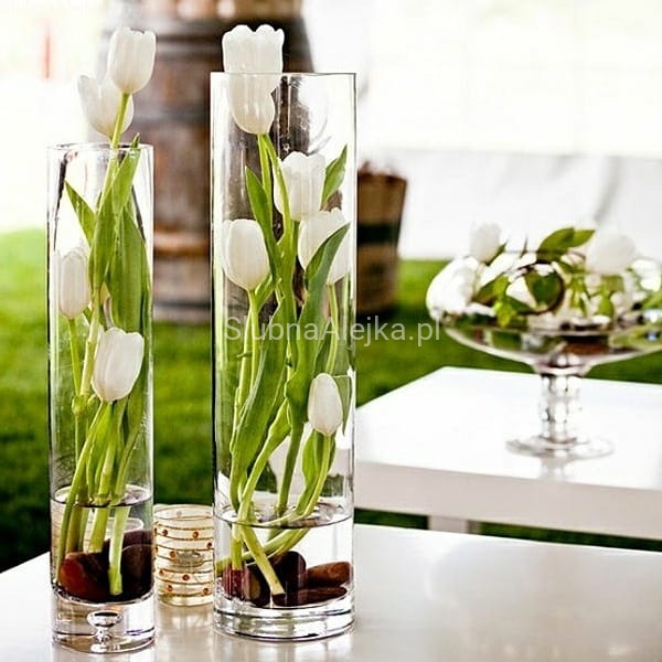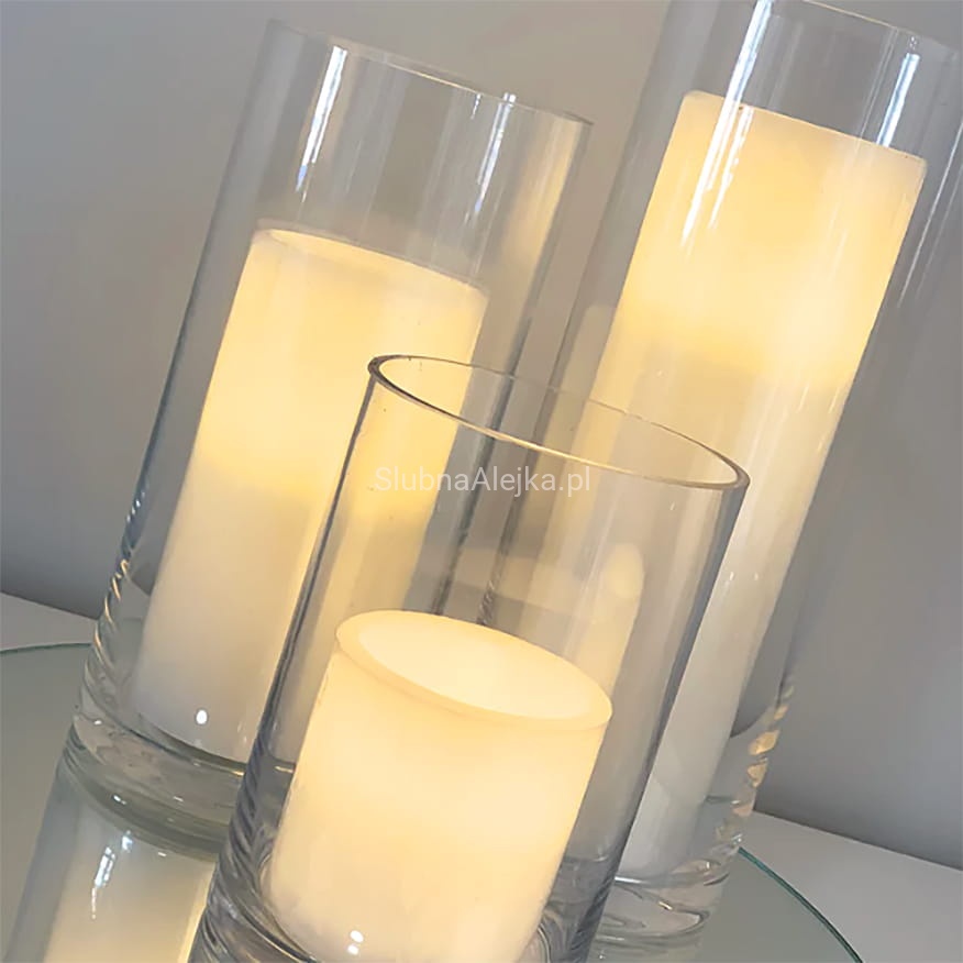 Wazon szklany cylinder warto wykorzystać w zestawie, aby z kilku szklanych lampionów utworzyć obszerne punkty świetlne. Na stołach, z uwagi na ograniczoną ilość miejsca, nie jest to możliwe, aby użyć np. 5 takich świeczników, ale na komodach lub w przejściach już tak. Zachęcamy zatem do zakupu szklanych wazonów/cylindrów w większych ilościach.