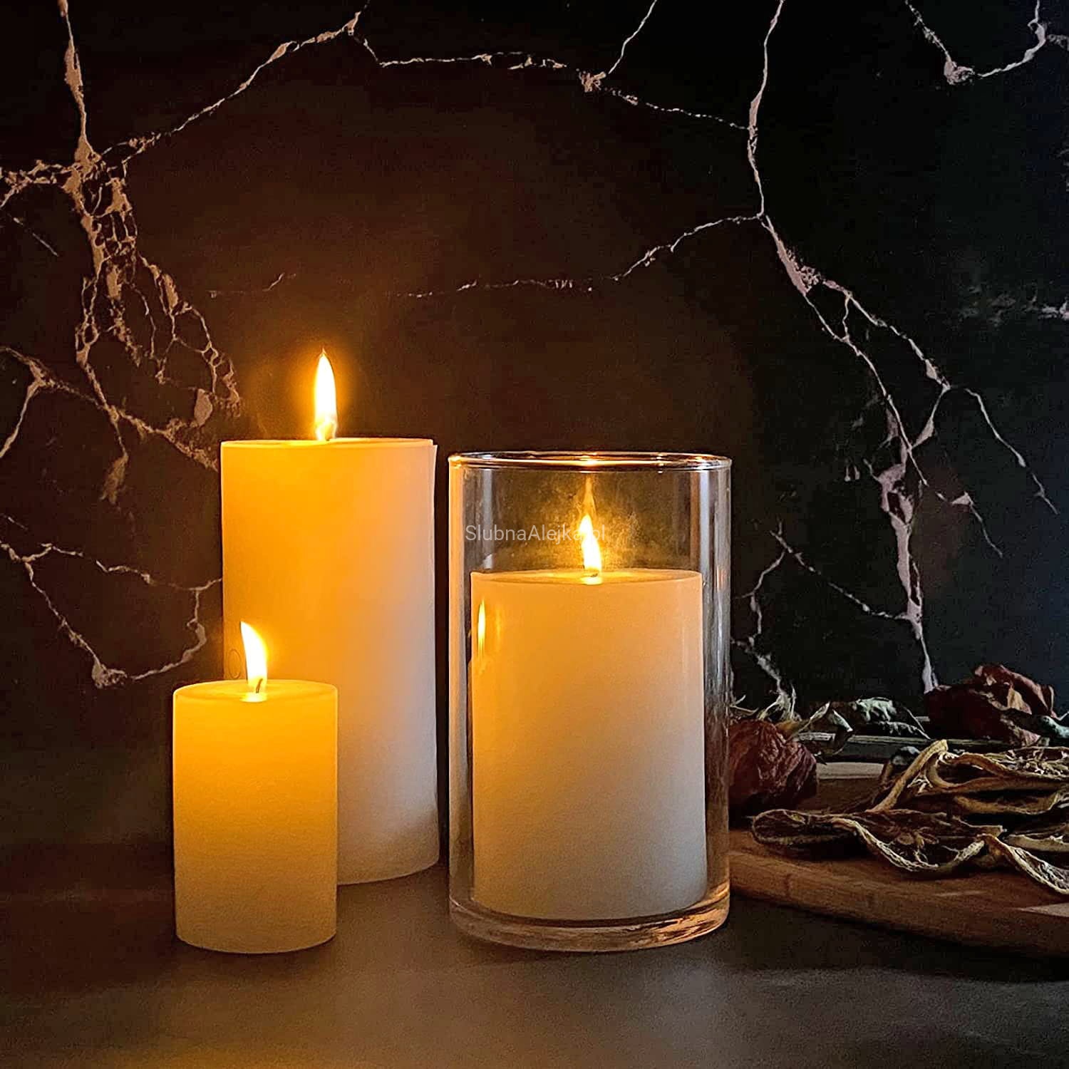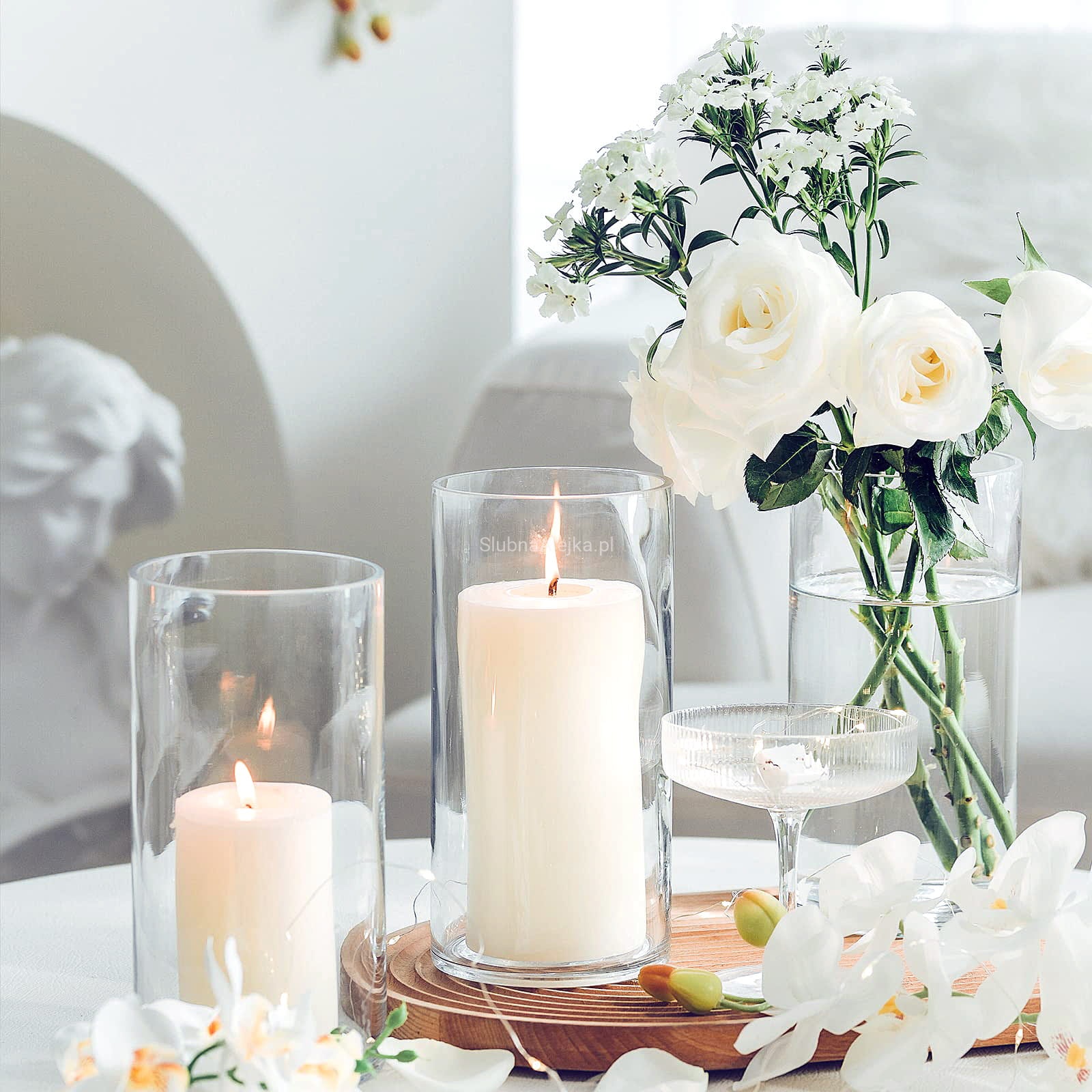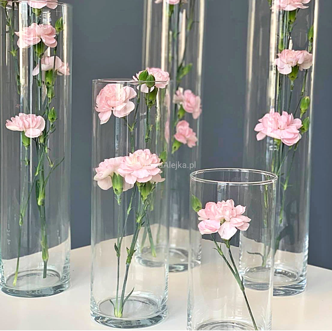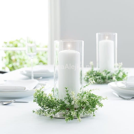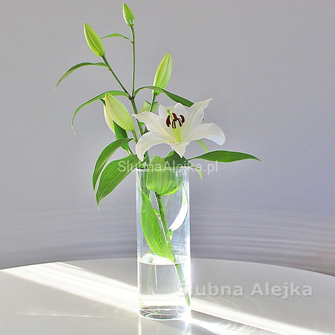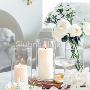 Prosta forma wazonu szklanego cylindra pozwala na wykonanie efektownych zdobień z liści i wstążek również na jego zewnętrznej stronie zaś grube dno uwydatnia walory kompozycji wykorzystujących piasek dekoracyjny, kamienie czy perły wodne. To wazon, który sprawdzi się zarówno jako dekoracja kościoła jak i dekoracja na stole weselnym.