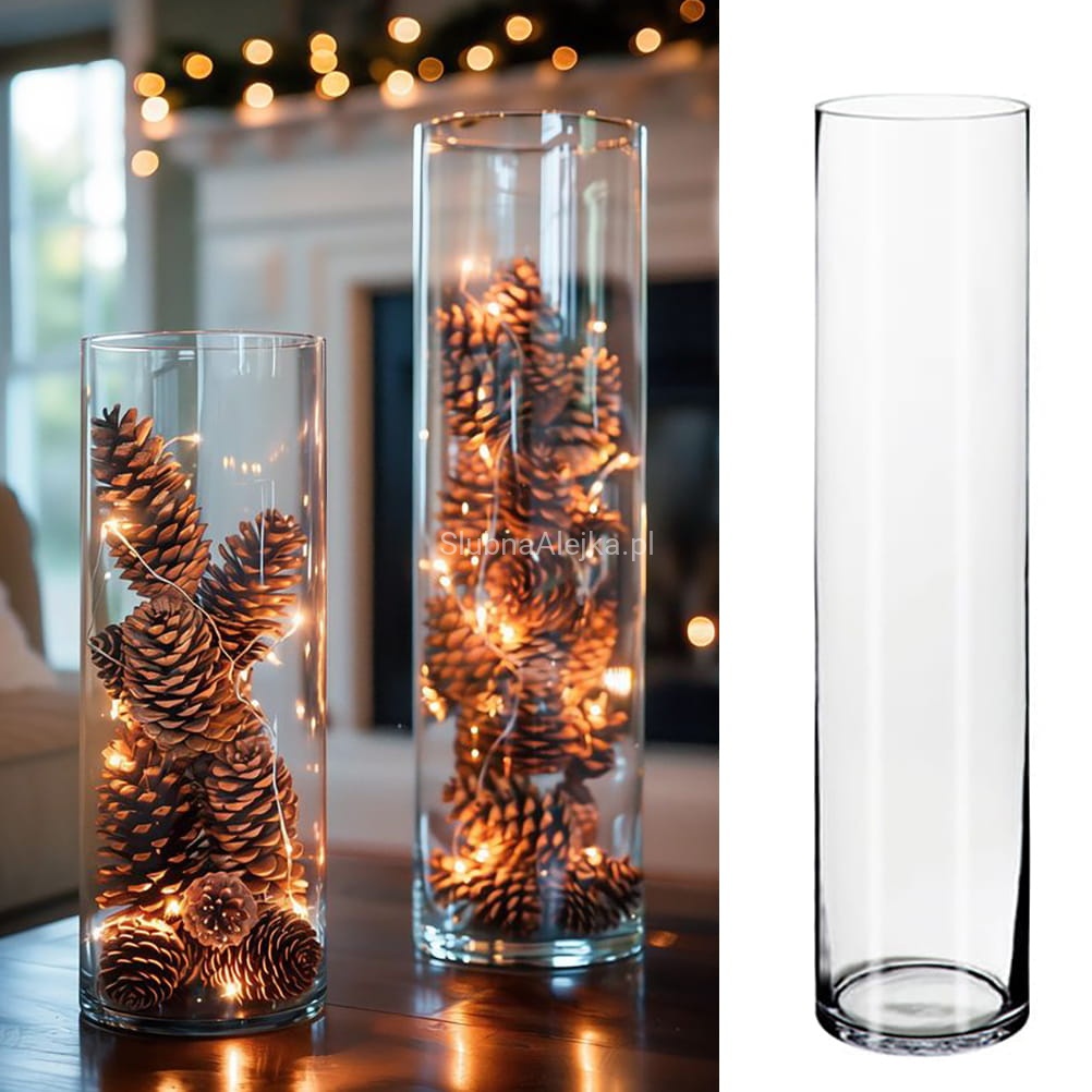 Świąteczne dekoracje to cała masa możliwości, aby ten szczególny czas w roku upłynął w przyjemnej i pięknej atmosferze. Nasze wazony doskonale sprawdzą się nie tylko w domu, ale i w restauracji, czy podczas świątecznego przyjęcia. Proponowany przez nas wazon szklany w kształcie cylindra jest najwyższym z wazonów tego rodzaju. Swoją stabilność zawdzięcza grubemu szkłu, z którego został wykonany. Dzięki swojej wysokości, idealnie nadaje się do wypełnienia świątecznymi szyszkami, czy bombkami. Idealny do długich kwiatów takich jak długie róże, kalie, lilie, jaskry i mieczyki. Dookoła wazonu można przewiązać szerszą lub węższą wstążkę w kolorze kwiatów. Tak naprawdę oprócz kwiatów i delikatnej wstążki niczego więcej nie trzeba, ponieważ już taka kompozycja jest wyjątkową dekoracją świąteczną.