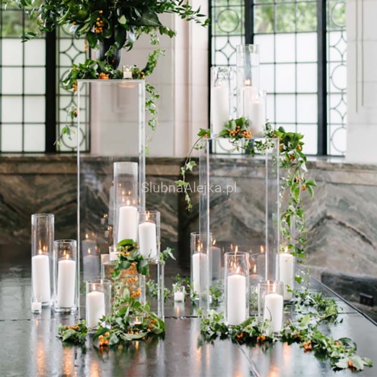 Tak naprawdę oprócz kwiatów i delikatnej wstążki niczego więcej nie trzeba do dekoracji wazonu szklanego cylindra , ponieważ już taka kompozycja jest wyjątkową dekoracją ślubną lub kościelną. Wazony szklane cylindry można ustawić w nawie głównej kościoła, ale nie tylko. Pięknie będą prezentowały się również przy wejściu do sali bankietowej.