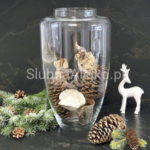 Wazon szklany wysoki New York jako dekoracja na stół weselny, pięknie eksponując strojne bukiety kwiatów. W zależności od jakie kwiaty chcemy do niego włożyć: sztuczne czy prawdziwe, taką oprawę dla nich możemy zastosować. Przy prawdziwych kwiatach będą to wstążki, oplatające wazon wypełniony wodą, a przy sztucznych – szereg akcesoriów i dodatków, którymi można wyłożyć go od środka.