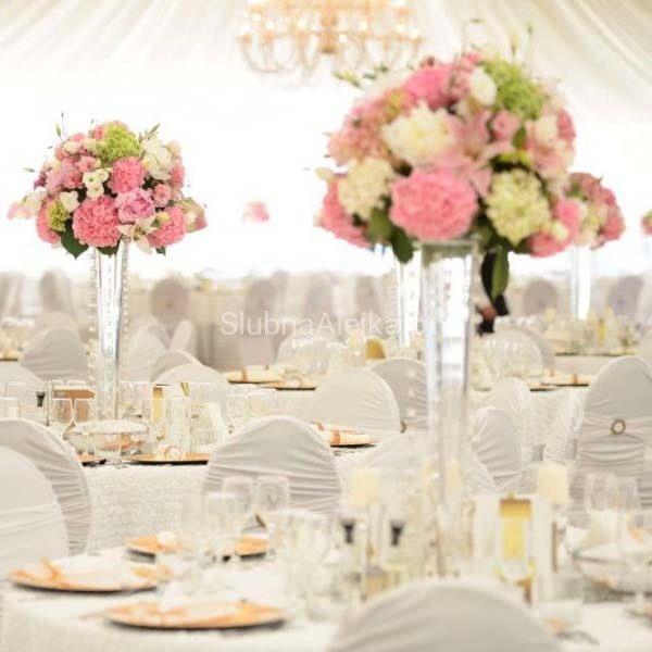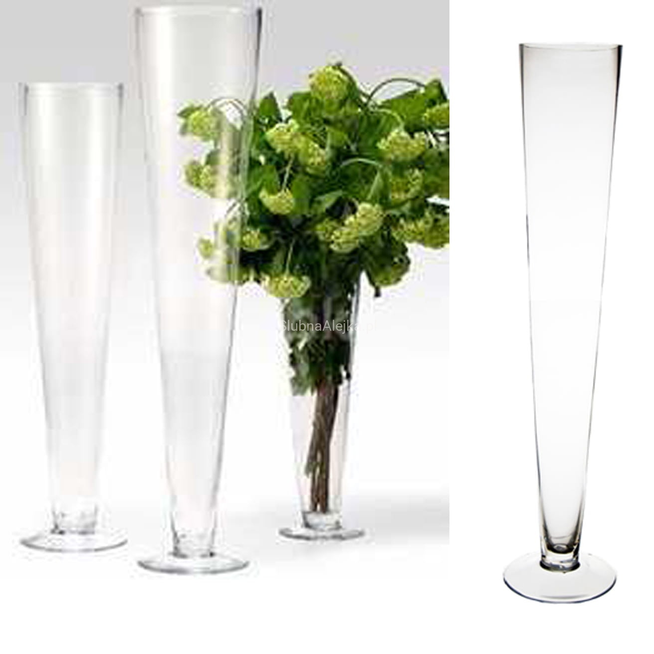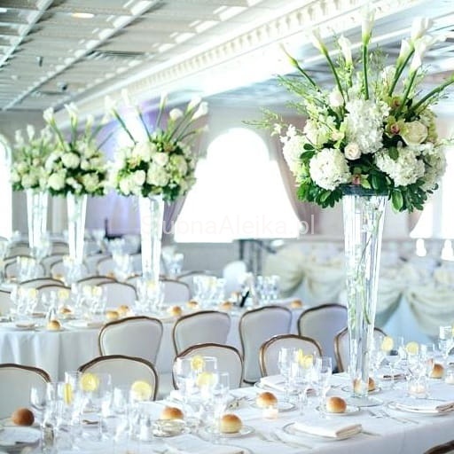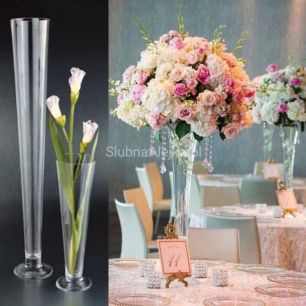Wazon szklany stożek o wysokości 40 cm to wysokie zgrabne naczynie, które wspaniale sprawdzi się jako dekoracja ślubna. Do wazonu można włożyć praktycznie każdy rodzaj kwiatów, szczególnie tych o długich łodygach. Mogą to być róże, słoneczniki, a także lilie. Sam kształt wazonu jest na tyle dekoracyjny, że nie wymaga żadnej dodatkowej oprawy. Na stołach będzie wyróżniał się spośród dodatków, eksponując urodę swej zawartości.