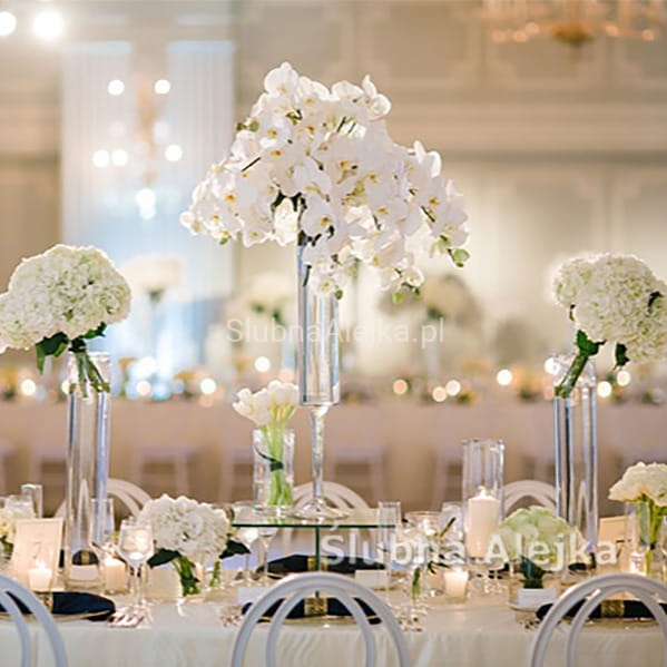Wazon szklany tuba na długiej nodze doskonale sprawdzi się jako centralna dekoracja okrągłego stołu weselnego lub jako jedna z dekoracji w przypadku stołów prostokątnych. Dzięki zastosowaniu długiej, smukłej nogi wazon jest stabilny, a jednocześnie nie stanowi przeszkody dla gości weselnych siedzących naprzeciwko siebie - dekoracja znajduje się wyżej niż wysokość wzroku, co jest wygodne dla gości.