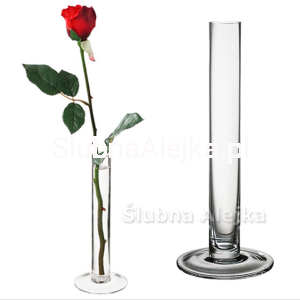 Ten niewielki wazonik szklany menzurka na jeden kwiat z przezroczystego szkła to delikatny flakonik, który przypomina wyglądem karafkę. Ma delikatne zdobienie w formie skręconych żłobień i delikatnych wybrzuszeń. Dzięki temu nie jest prostym wazonikiem a ozdobą, którą można wykorzystać jako dekorację ślubną.