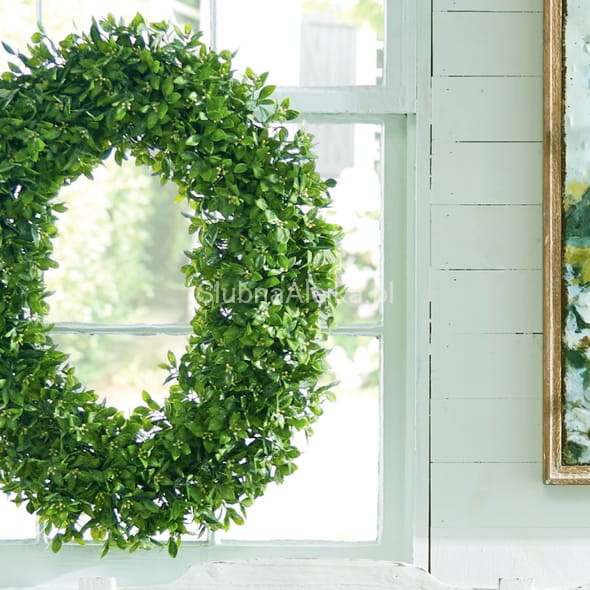 Wianek bukszpanowy został wykonany ze sztucznego tworzywa, ale zarówno kolorem, jak i kształtem listków do złudzenia przypomina prawdziwy bukszpan. Swoją popularność zyskał jako ozdoba okien w domowych czterech ścianach, jednak ze względu na swój sielski charakter wykorzystuje się go także jako ozdobna kościoła lub dekoracja weselna. Można zawiesić go na tasiemce i podwiesić zarówno w oknie sali restauracyjnej, jak i na ścianie, czy drzwiach – w wejściu do domu weselnego. W pozycji poziomej spełnia rolę jako stroik wokół lampionu lub świecznika. Ponieważ można umieścić w nim różnego rodzaju aplikacje – łatwo dostosować jego charakter do charakteru uroczystości, którą zdobi.