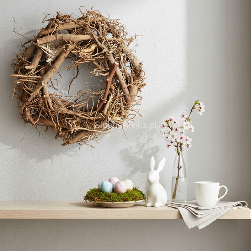 Ten wyjątkowo oryginalny wianek korzeniowy został wykonany z naturalnych gałązek i korzeni wierzby. Stanowi bazę do wykonania dekoracji florystycznej. Do jej wykonania wystarczą aplikacje osadzone na miękkim druciku, którymi można opleść wianek, aby usztywnić ich mocowanie.