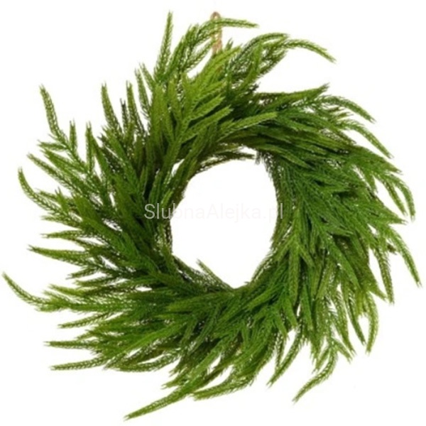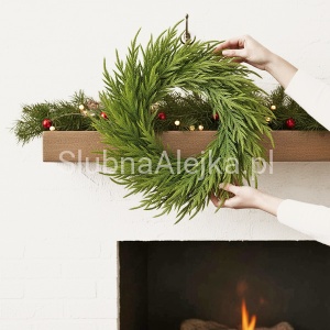 Piękny w swej prostocie wianek wykonany z wysokiej jakości tworzywa sztucznego. Najczęściej stanowi bazę do wszelkich kompozycji florystycznych, ale może być także samodzielną ozdobą świąteczną. Do stosowania w domu, jak i na zewnątrz jako ozdoba tarasu, czy ogrodu. Łatwo przymocować do niego dodatkowe aplikacje. Udekorowany lampkami i bombkami znajduje swoje zastosowanie jako ozdoba świąteczna. Najpopularniejszym miejscem na powieszenie wianka są drzwi wejściowe restauracji lub domu, ale można go także umieścić nad kominiem lub w oknie. Ten gęsty, żywo zielony wianek stanowi idealną bazę do wykonania pięknej bożonarodzeniowej dekoracji w przystępnej cenie.