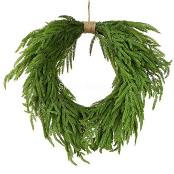 Piękny w swej prostocie wianek wykonany z wysokiej jakości tworzywa sztucznego. Najczęściej stanowi bazę do wszelkich kompozycji florystycznych, ale może być także samodzielną ozdobą świąteczną. Do stosowania w domu, jak i na zewnątrz jako ozdoba tarasu, czy ogrodu. Łatwo przymocować do niego dodatkowe aplikacje. Udekorowany lampkami i bombkami znajduje swoje zastosowanie jako ozdoba świąteczna. Najpopularniejszym miejscem na powieszenie wianka są drzwi wejściowe restauracji lub domu, ale można go także umieścić na ścianie. Ten gęsty, żywo zielony wianek stanowi idealną bazę do wykonania pięknej bożonarodzeniowej dekoracji w przystępnej cenie.