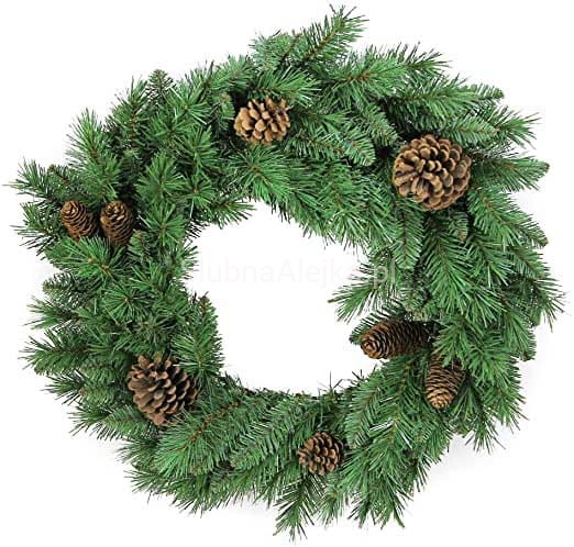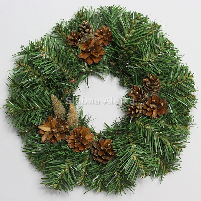 Piękny w swej prostocie wianek wykonany ze sztucznych gałązek zielonego świerku. Dodatkowo zdobiony szyszkami. Najczęściej stanowi bazę do wszelkich kompozycji florystycznych, ale może być także samodzielną ozdobą świąteczną. Do stosowania w domu, jak i na zewnątrz jako ozdoba tarasu, czy ogrodu. Łatwo przymocować do niego dodatkowe aplikacje. Udekorowany bombkami lub wstążkami znajduje swoje zastosowanie jako ozdoba świąteczna. Najpopularniejszym miejscem na powieszenie wianka są drzwi wejściowe restauracji lub domu, ale można go także umieścić na ścianie. Ten żywo zielony wianek stanowi idealną bazę do wykonania pięknej bożonarodzeniowej dekoracji w przystępnej cenie.