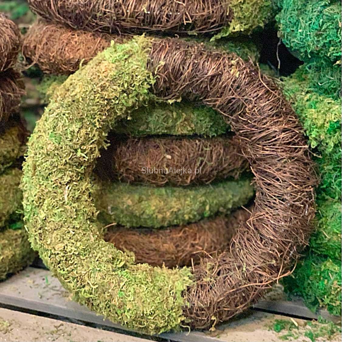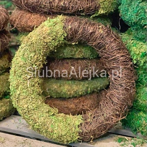 Ten wyjątkowo oryginalny wianek został wykonany z całkowicie naturalnego, jasnozielonego mchu oraz gałązek faszyny. Stanowi bazę do wykonania dekoracji kościoła lub sali weselnej. Jest to dekoracja florystyczna, a zatem do jej udekorowania wystarczą aplikacje osadzone na miękkim druciku, którym można opleść wianek, aby usztywnić ich mocowanie.