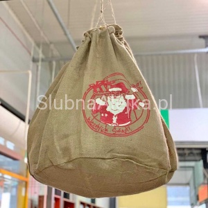 Wspaniały, pojemny worek na prezenty z wizerunkiem Św. Mikołaja i napisem "Wesołych Świąt". Idealny na świąteczne prezenty! Uszyty z juty, ściągany sznurkiem. Wystarczy wpisać imię i worek wspaniale zaprezentuje się pod choinką.