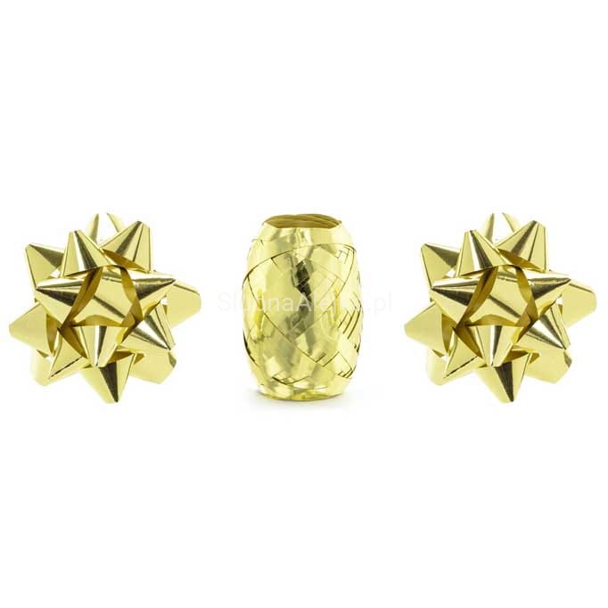 Wstążka i 2 rozety zloty metalik. Wymiary wstążki: szerokość ok. 5 mm, długość ok. 10 m, średnica rozety ok. 8 cm. Bardzo przydatne do dekoracji i pakowania prezentów, czy świątecznych ozdób. Bardzo dobrze komponuje się z dekoracjami świątecznymi w stylu kraft i merry christmas.